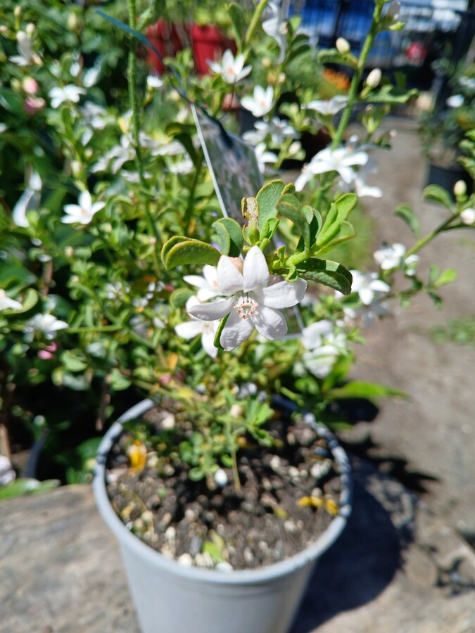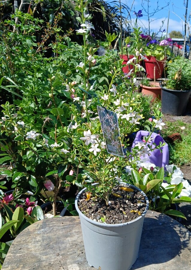 Eriostemon Myoporoides- Profusion is a dense shrub with fragrant glossy green leaves and wonderful flowers. In spring, it blossoms with white star-shaped flowers. The leaves smell almost like apples, and it makes a great hedge.