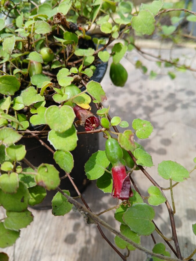 A native creeping Fuchsia, Fuchsia Procumbens will grow around 15cm tall and cover between 60cm-1m in width. It has cute yellow flowers in spring, followed by fruits which ripen to green. Hardy, but deciduous in colder areas. Best in semi-shade.