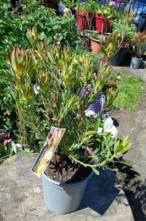 An evergreen Leucadendron, with lovely light green foliage. They will grow to approximately 1.5m tall by 1m wide, flowering with large cone-shaped creamy yellow, red-tinged flowers in spring.