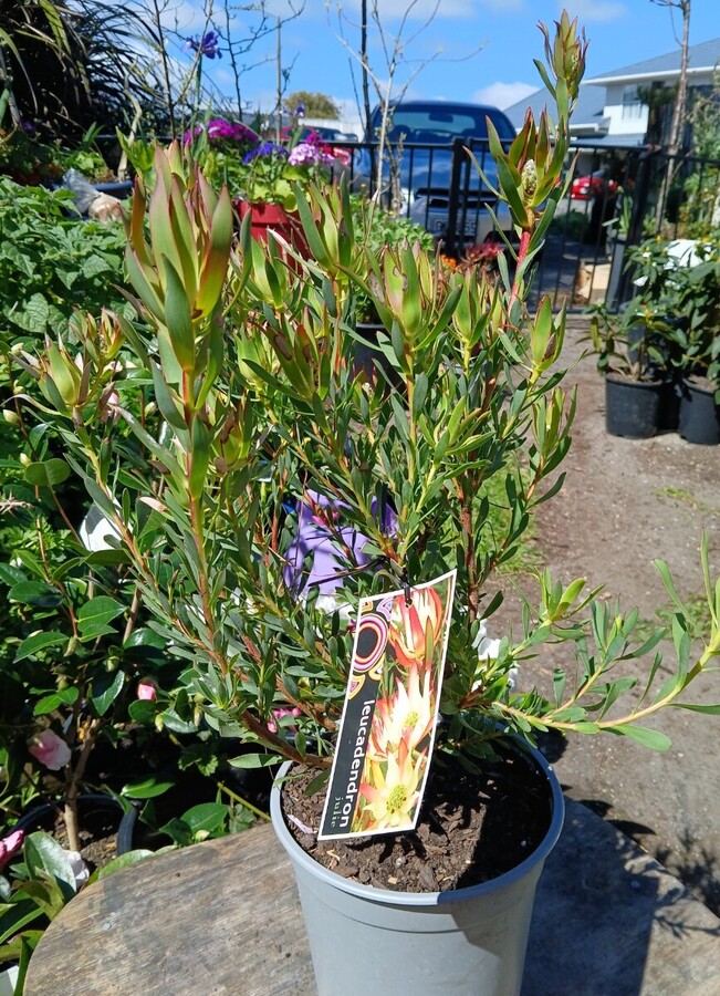 Prefers acidic well-drained soil in a sunny spot away from harsh frosts. Please avoid using phosphate-based artificial fertilisers or anything high in Nitrogen. Leucadendrons will not appreciate this.