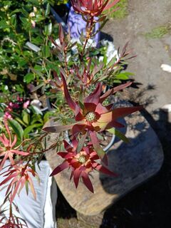 A lovely Leucadendron growing to around 1.5mx1m, this one has wonderful reddish foliage. In late autumn through to spring, pinkish red cone-shaped flowers appear.