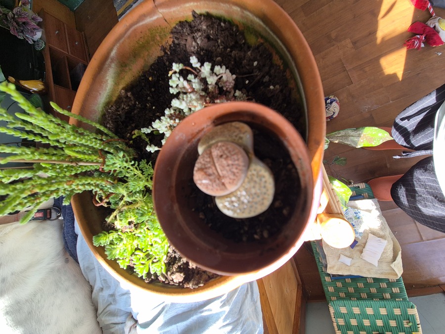 Very cute little succulents from the ice plant family. Lithops have earned their name for looking very much like stone. A gorgeous yellow flower blossoms from the middle of the plants around autumn, once they are mature.