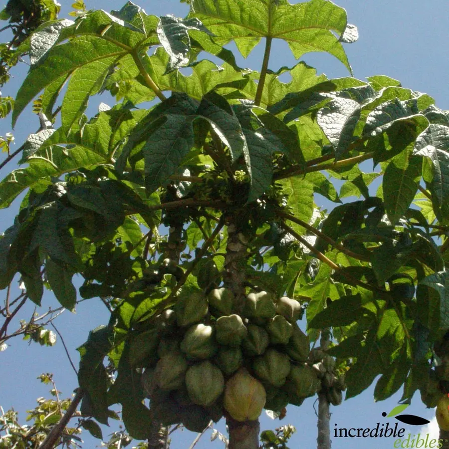 Mountain Paw Paw has a bright yellow fruit about the size of a small apple but with strongly lobed longitudinal segments. The fruit is formed on new growth and can be eaten as a vegetable or fresh fruit. Fruit is produced within two years if male and female flowers are present. Male and female flowers may be produced on the same plant or separate plants. To ensure good fruit production, it's best to have at least two trees. Each tree can produce up to 50-60 fruits per season. Harvest is in late winter to early summer when the fruit turns yellow and slightly softens.